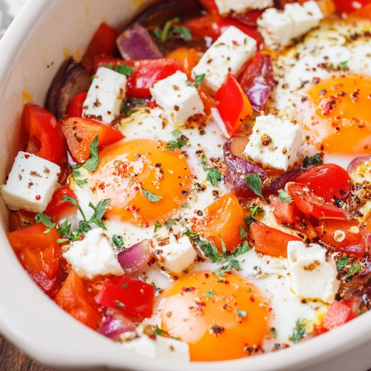 This Mediterranean-style dish brings together creamy feta cheese and perfectly baked eggs in one skillet. The combination of sautéed vegetables—tomatoes, bell peppers, onions, and garlic—creates a flavorful base that pairs beautifully with the richness of feta and eggs. Aromatic oregano and fresh parsley add brightness, while optional red pepper flakes provide gentle warmth. The result is a satisfying, protein-packed breakfast that comes together in under 30 minutes, perfect for lazy weekends or impressive brunch hosting.