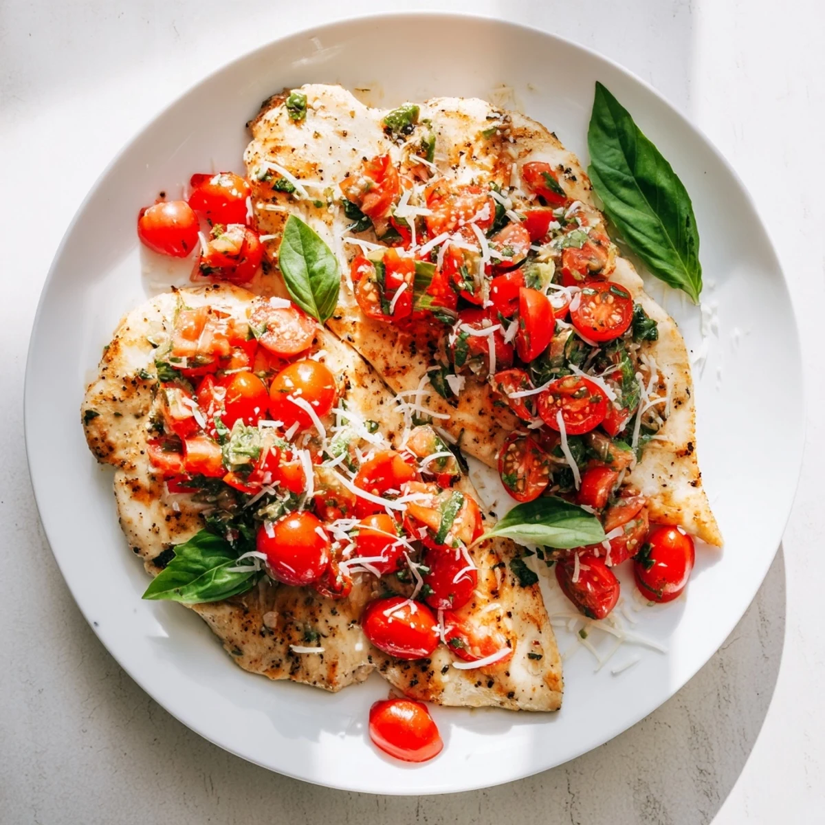 Sometimes I add fresh mozzarella pearls to the tomato mixture if I want something extra indulgent, and they get slightly warm and creamy when they hit the hot chicken. You can also sprinkle red pepper flakes into the bruschetta for a little kick that plays really nicely against the sweet tomatoes.