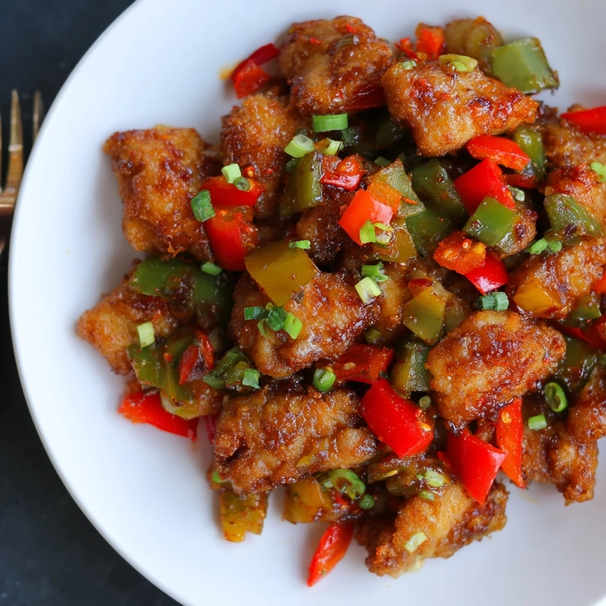 This Indo-Chinese favorite pairs crispy, marinated chicken with a spicy-sweet chilli glaze and crunchy bell peppers and onions. Marinate pieces with cornflour, flour, egg and ginger-garlic, then deep-fry until golden. Stir-fry aromatics, add soy, chilli sauce, ketchup and a cornflour slurry to coat evenly, then toss with the fried chicken and garnish with spring onions.