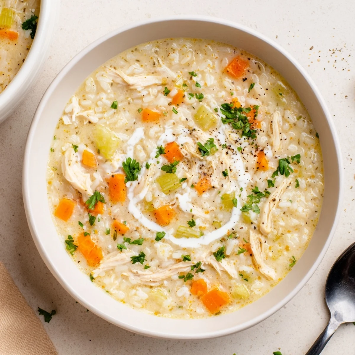 This velvety chicken and rice soup combines shredded chicken, long-grain rice, and softened onion, carrots and celery in a buttery roux. Gradually whisk in chicken broth, simmer until rice is tender, then stir in milk and cream and finish gently until thick and silky. Total time about 50 minutes. For a gluten-free option, replace flour with a cornstarch slurry; finish with parsley or a squeeze of lemon for freshness.