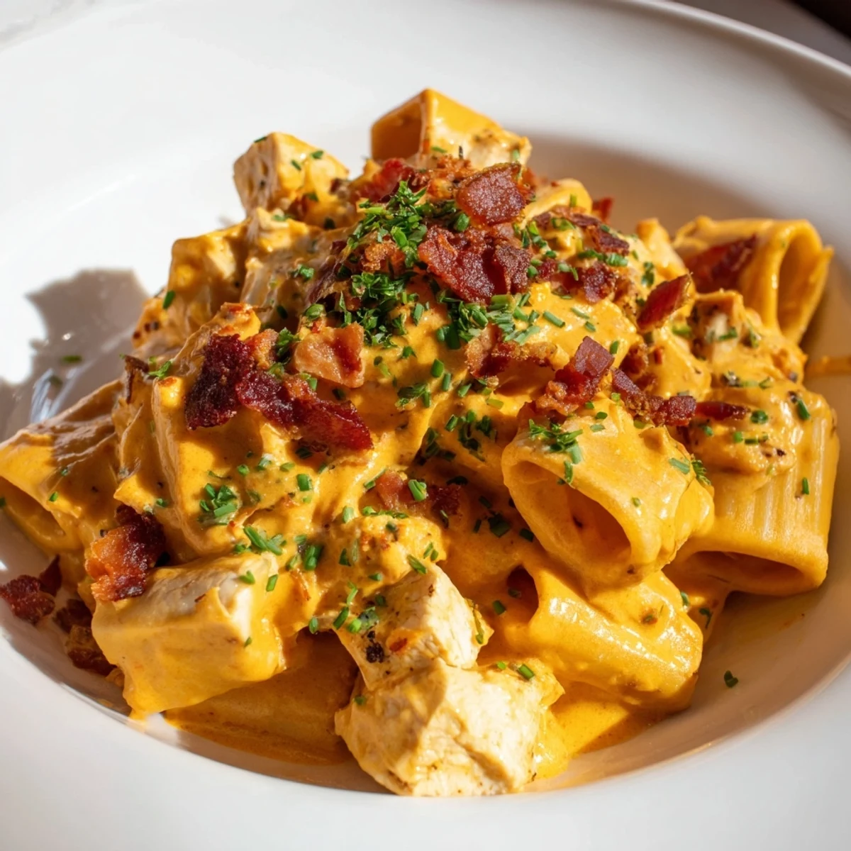 This indulgent pasta features tender diced chicken seasoned with smoked paprika and garlic powder, cooked until golden in butter. The creamy cheese sauce combines softened cream cheese, heavy cream, and sharp cheddar for an incredibly rich texture. Crispy chopped beef bacon adds savory crunch throughout, while fresh spring onions, parsley, and chives bring bright herbal notes to balance the decadence.
