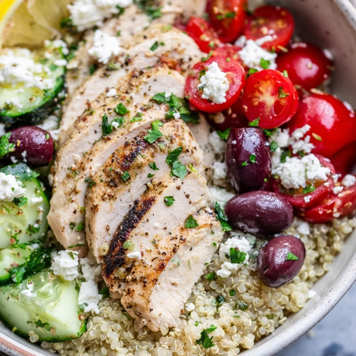 This vibrant bowl combines tender grilled chicken seasoned with oregano, smoked paprika, and cumin with fluffy quinoa cooked in chicken broth. Fresh cherry tomatoes, crisp cucumber, red onion, and briny Kalamata olives add texture and brightness, while crumbled feta brings creamy richness. A tangy lemon-honey mustard dressing ties everything together. The entire dish comes together in just 45 minutes, making it perfect for busy weeknights or meal prep. Each serving delivers 35 grams of protein while remaining gluten-free.