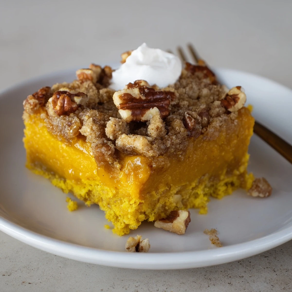 This simple autumn bake layers spiced pumpkin puree mixed with sweetened condensed milk and eggs in a 9x13 pan, sprinkles dry yellow cake mix on top, then pours melted butter and chopped pecans over everything. Bake at 350°F for 45–55 minutes until set, cool at least 30 minutes, and serve warm or chilled with whipped cream or ice cream. Variations include toasted pecans, spice cake mix, or dairy-free swaps.