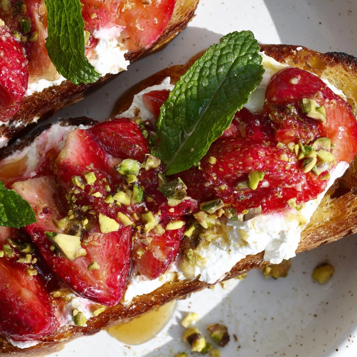 Transform ordinary toast into something extraordinary with this simple yet impressive combination. Fresh strawberries roast until jammy and sweet with honey and vanilla, while ricotta becomes incredibly light and fluffy when whipped with cream. The contrast of warm, syrupy berries against cool, creamy cheese on crispy bread creates perfect bites. Ready in just 30 minutes, this dish works equally well for lazy weekend brunches or afternoon snacks. Garnish with fresh mint, flaky salt, and a final honey drizzle to elevate each serving.