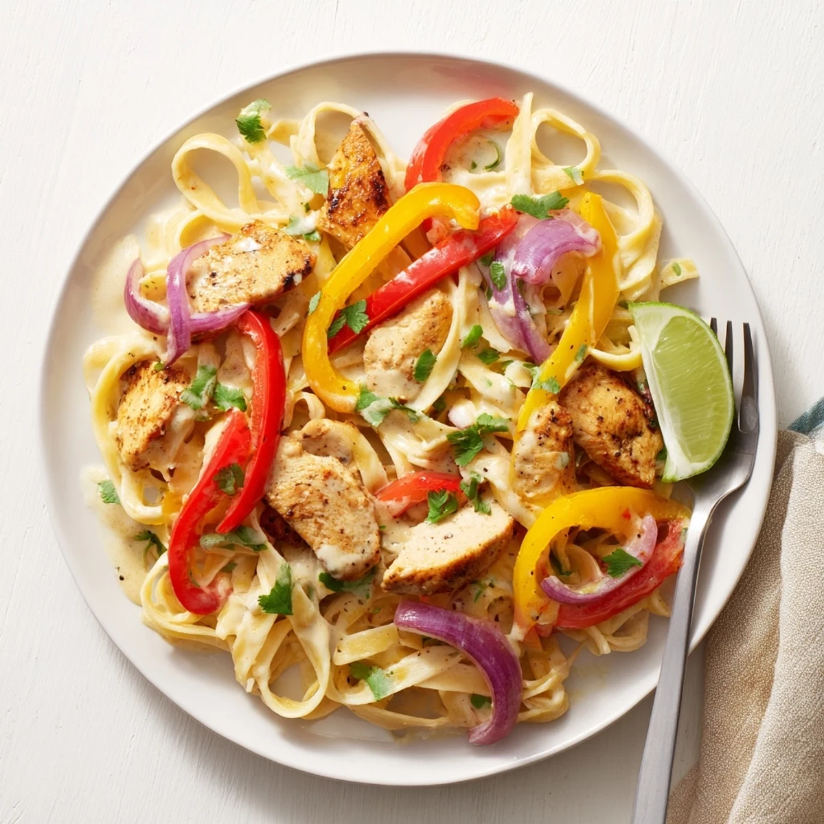 This Southwest-inspired Alfredo transforms the classic Italian pasta dish with bold spices and vibrant vegetables. Seasoned chicken breasts are rubbed with chili powder, cumin, and smoked paprika, then pan-seared until lightly charred. Colorful bell peppers and red onions add sweetness and crunch, while jalapeño provides optional heat.