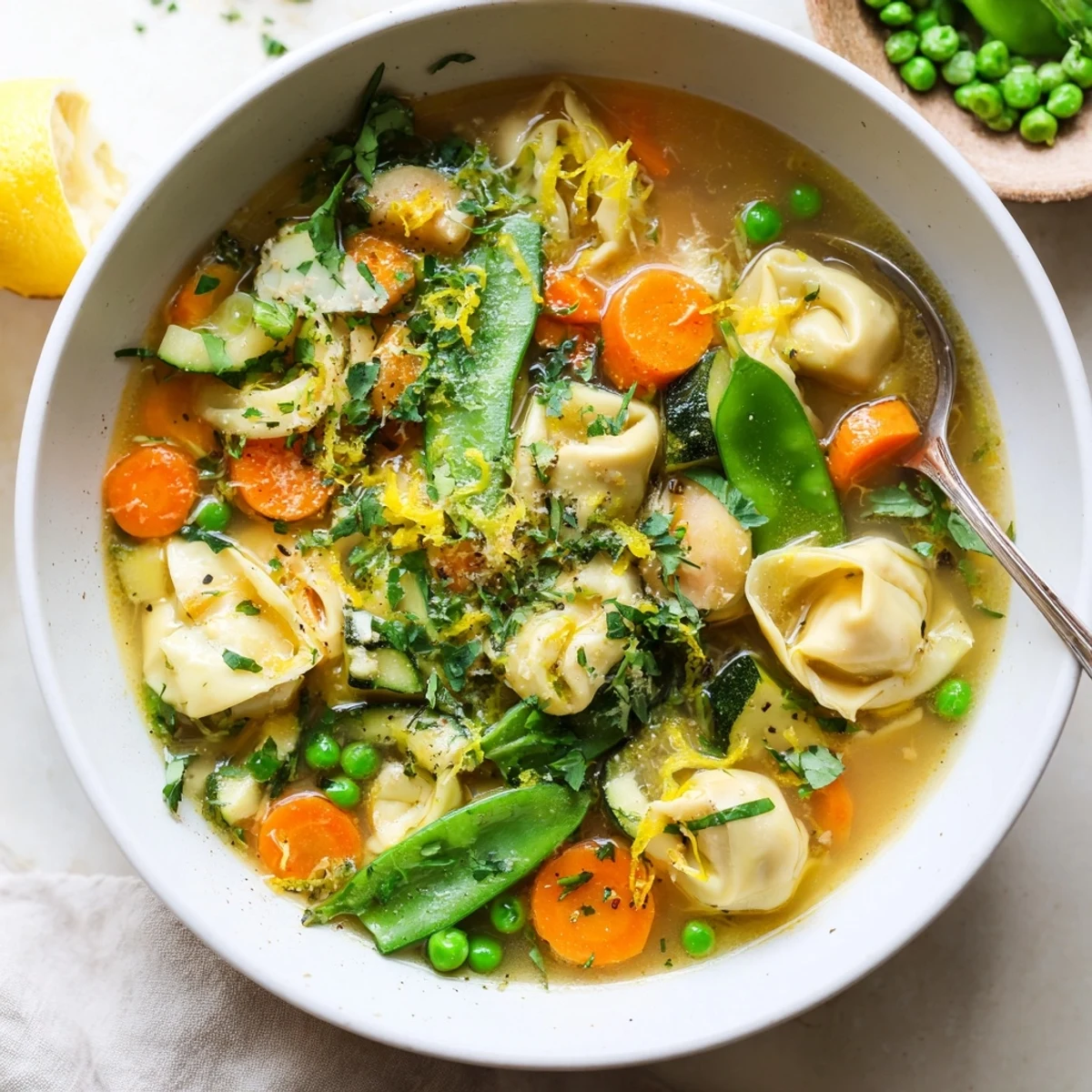 This vibrant Italian-style soup combines tender cheese tortellini with an assortment of fresh spring vegetables including carrots, zucchini, sugar snap peas, and baby spinach. Simmered in a fragrant vegetable broth with garlic and aromatic herbs, it creates a light yet satisfying bowl perfect for any season. Finished with bright lemon zest, fresh parsley, and grated Parmesan, each spoonful delivers comforting warmth with refreshing brightness. Ready in just 35 minutes, this vegetarian soup serves four beautifully and pairs wonderfully with crusty bread or a crisp white wine like Pinot Grigio.